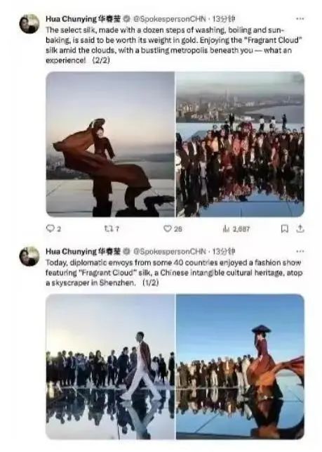 2024年1月4號“外交官看中國?廣東行”活動一行來到廣東省深圳市,近40個(gè)國家的駐華使節(jié)走進(jìn)前海合作區(qū),了解深港兩地在口岸交通、科創(chuàng)合作等領(lǐng)域的深度融合,感受前海在推進(jìn)深港融合、賦能粵港澳大灣區(qū)高質(zhì)量發(fā)展中的作用及成果。并在深超總部深灣屋頂國際會客廳觀“天空之境”觀看了一場非遺文化”香云紗“時(shí)尚秀,引來了外交部部長助理、發(fā)言人華春瑩的點(diǎn)贊,“身處繁華都市云間賞‘香云’紗,這是一種怎樣的體驗(yàn)!”
