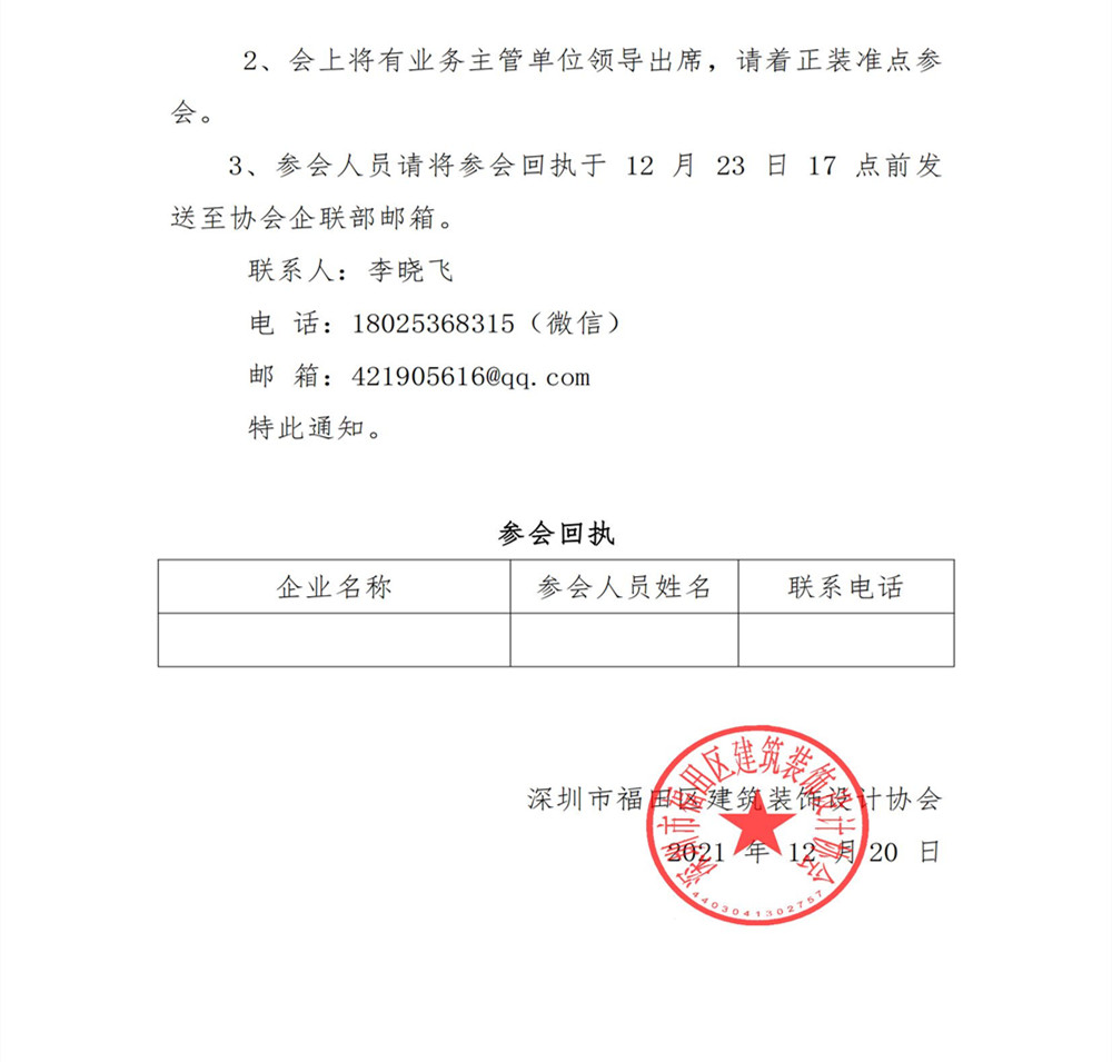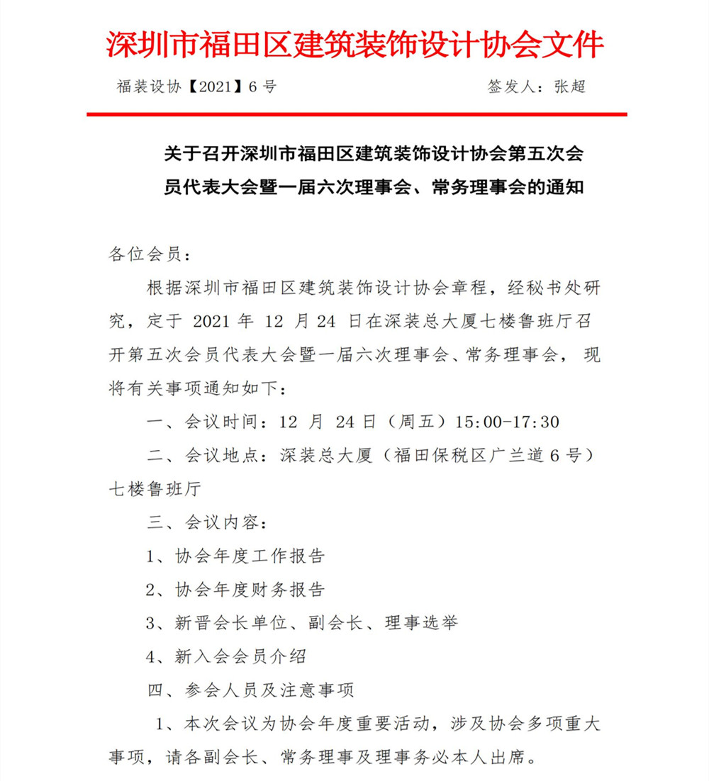 關于召開深圳市福田區建筑裝飾設計協會第五次會員代表大會暨一屆六次理事會、常務理事會的通知